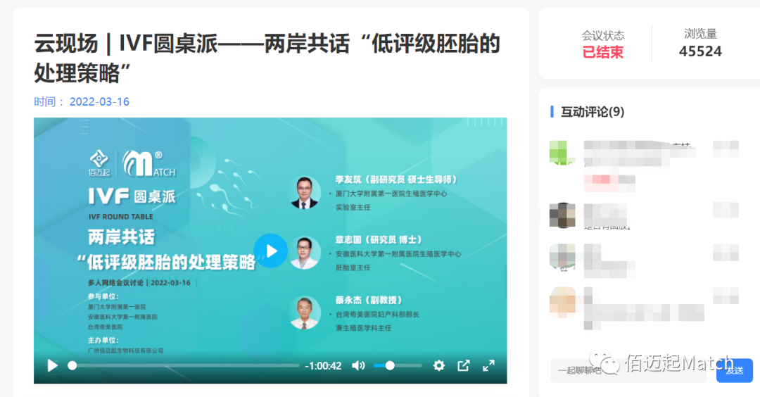 第五期IVF圆桌派-“低评级胚胎的处理策略”网络研讨会在3月16日下午16:00正式上线开播,会议截止结束时获得了4.5万的浏览量。非常感谢大家的支持与参与。